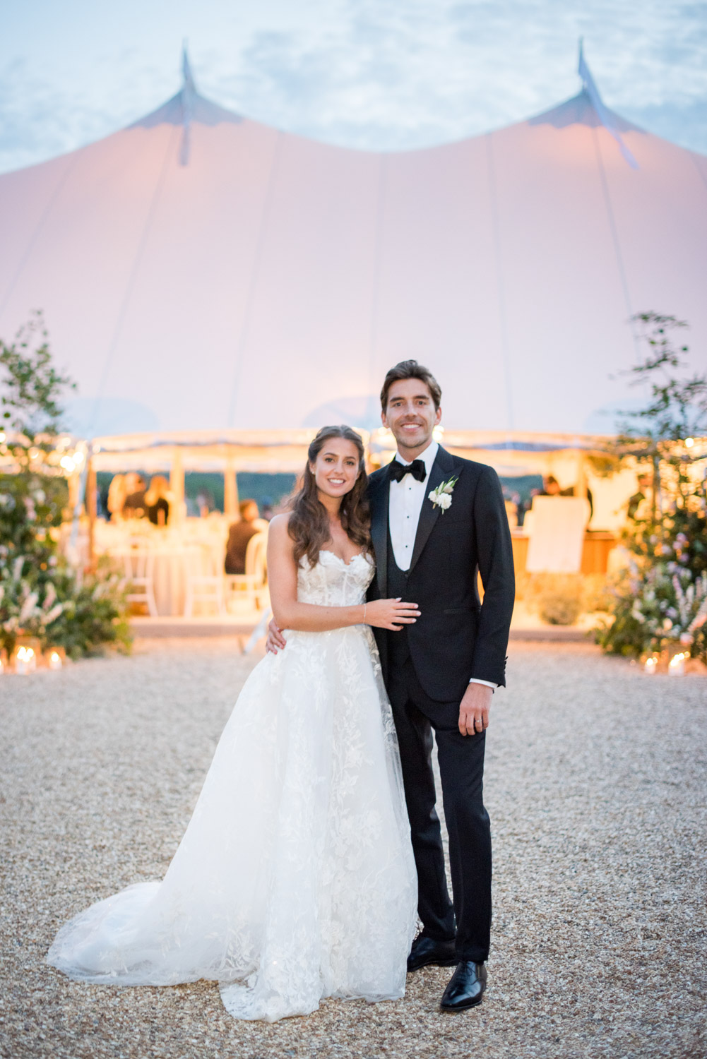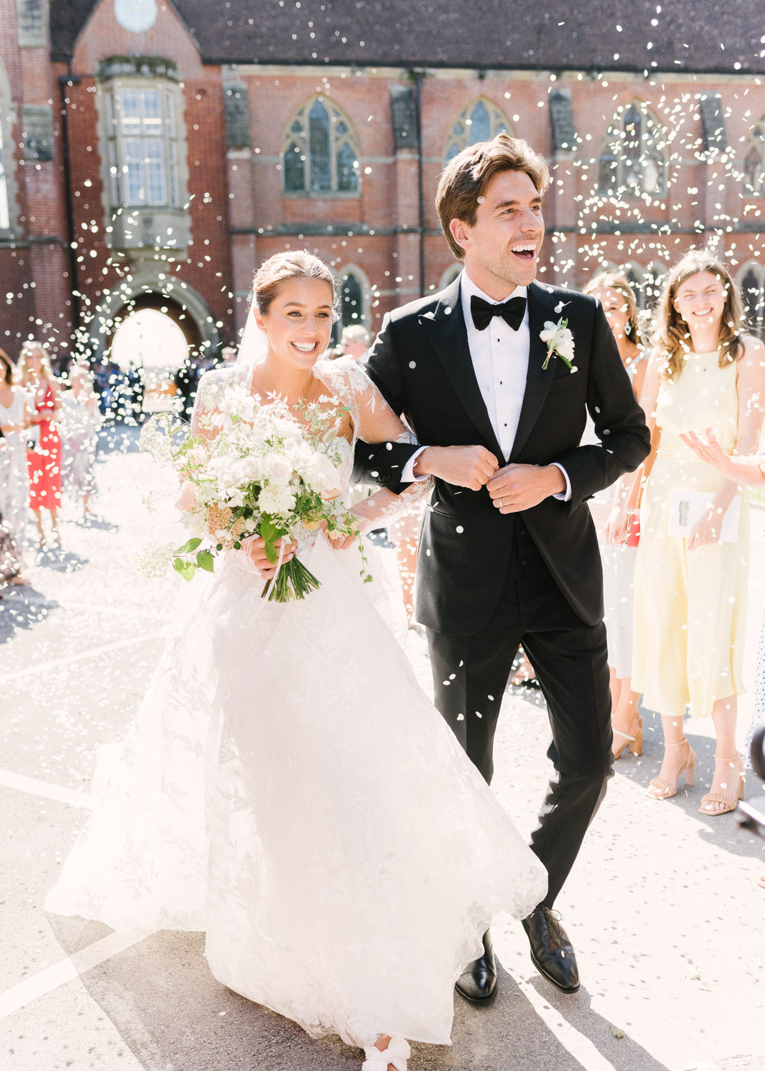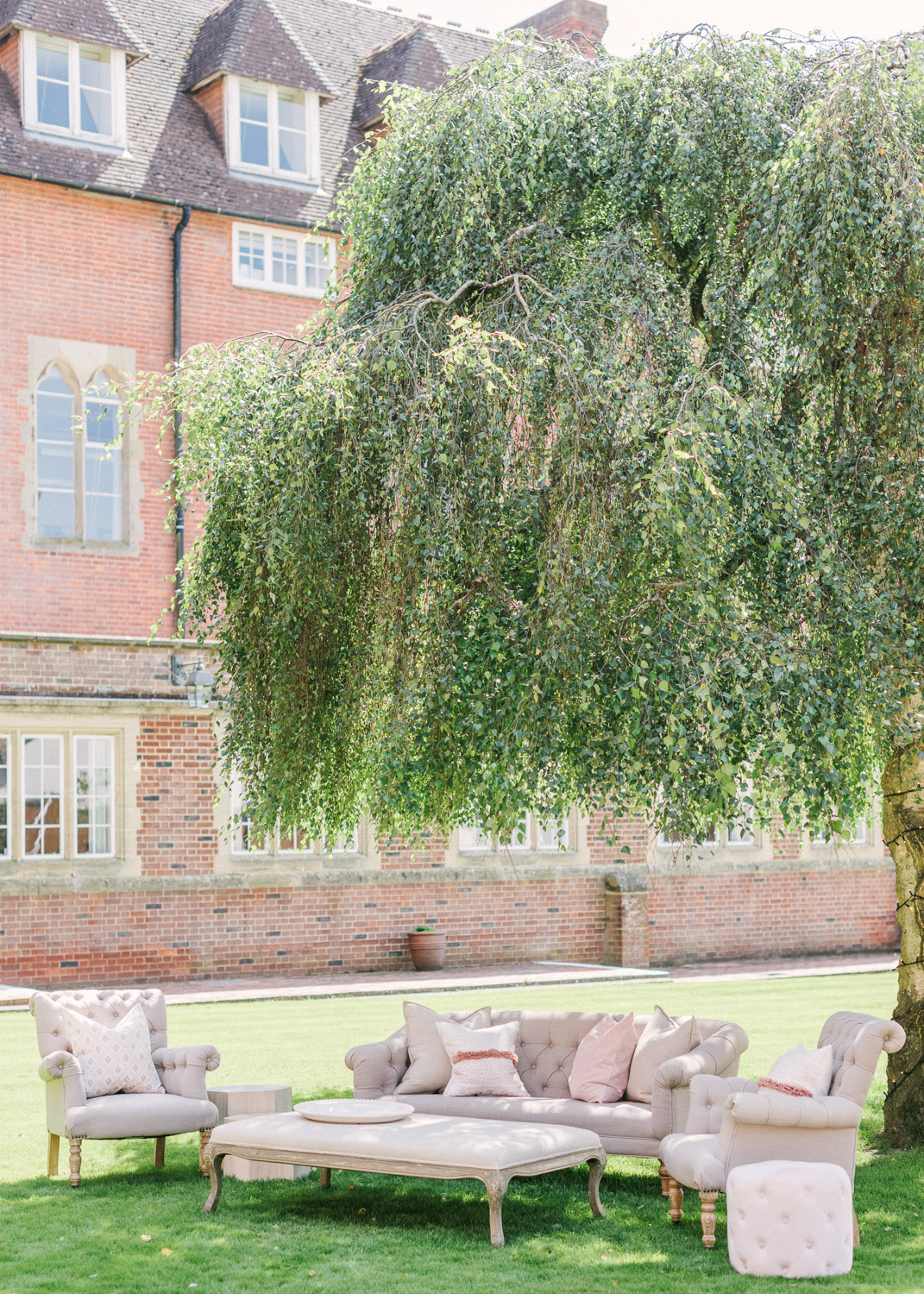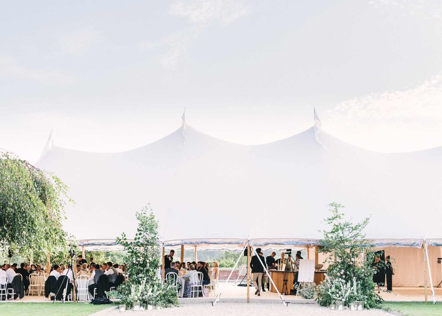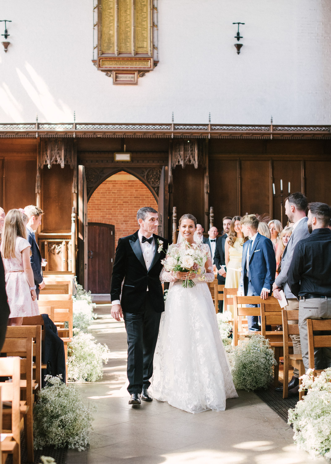 Ellie got ready at her family home surrounded by family and close friends before heading to Ardingly College to marry and celebrate with her husband and guests. Aelisabeta Flowers decorated the aisle of with big clouds of florals which looked so lovely with the light streaming in through the windows. It was a warm summer’s day so everyone was able to make the most of the lawn from the afternoon until late into the evening. The beautiful sperry tent looks oh-so pretty glowing in the low evening light. It was a day filled with love and laughter, planned to perfection by Cara at Katrina Otter Weddings.